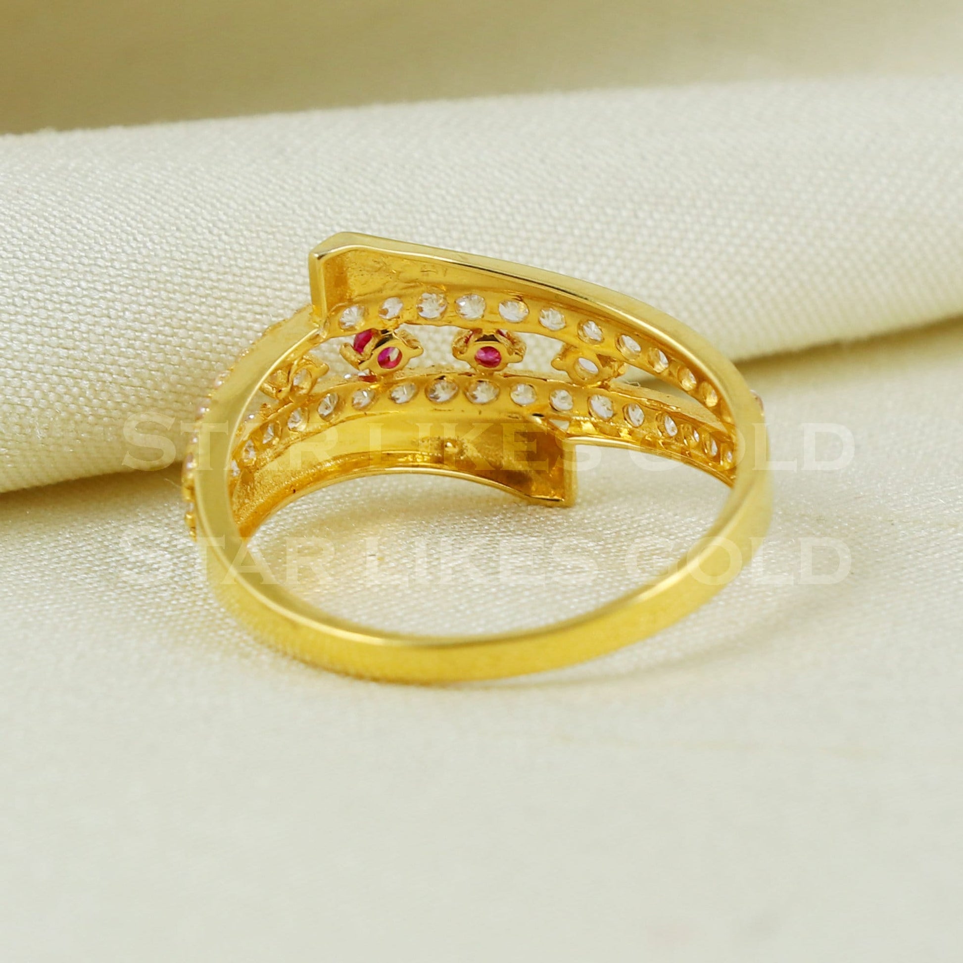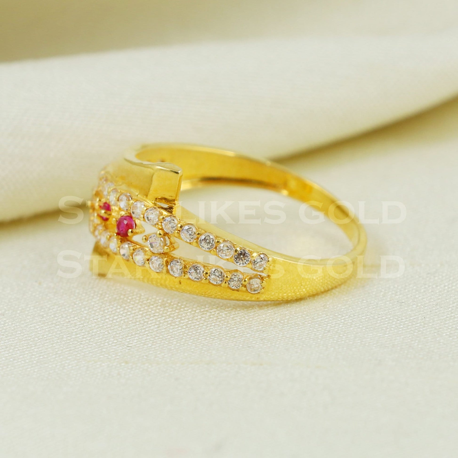 Elegant 18k Gold Ruby & CZ Stone Ring | Modern Wave Design Jewelry, B1043
