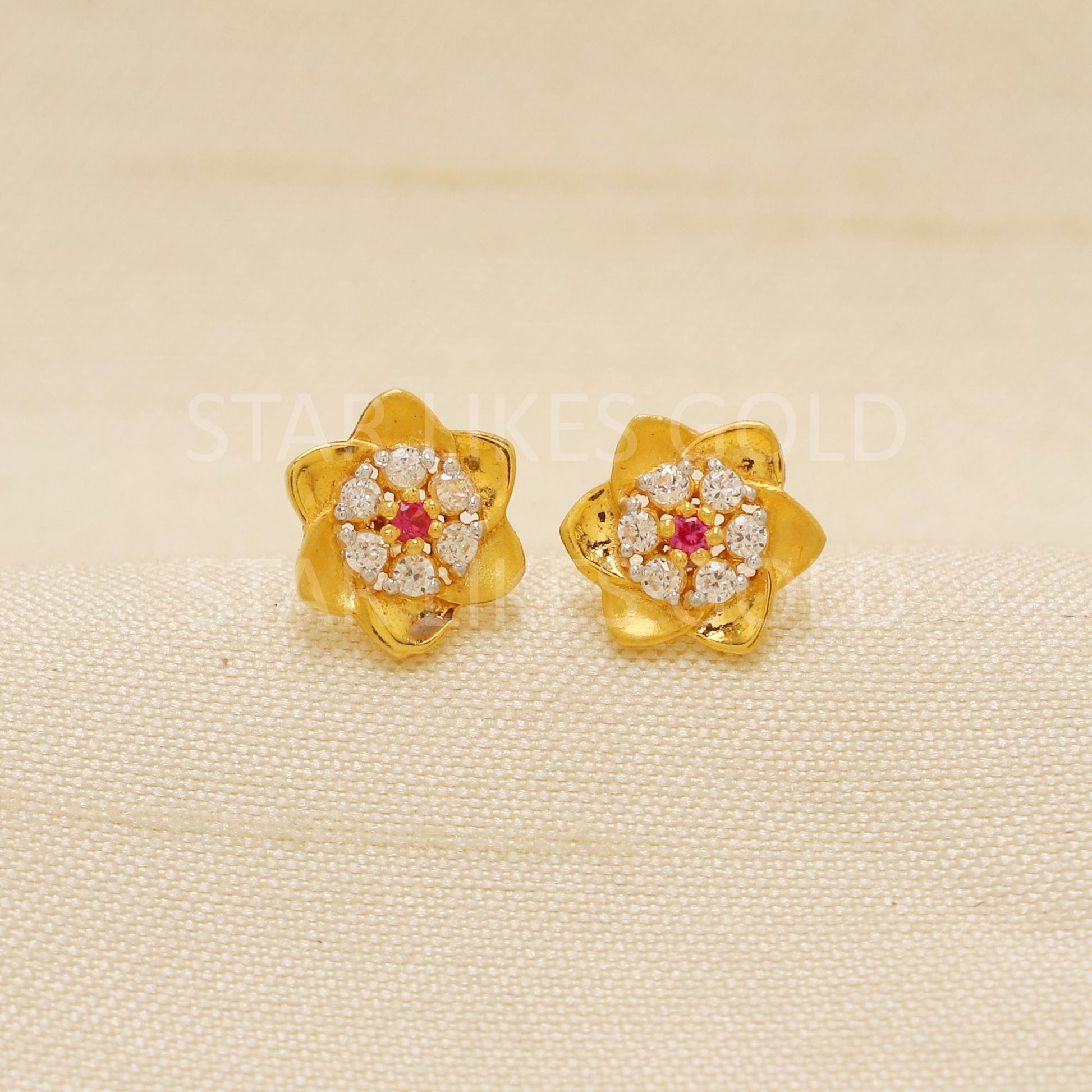 18K Gold Floral Stud Earrings | Ruby and CZ Flower Design | Secure Screw Back Indian Gold Jewelry